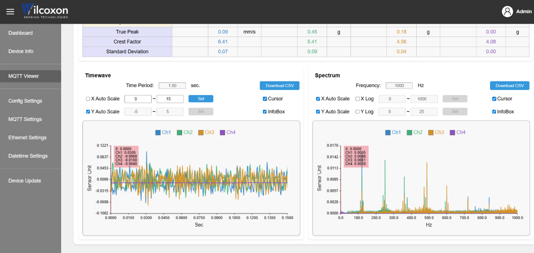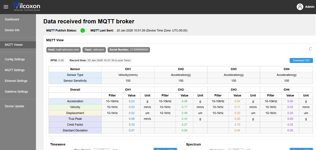 VDS130 Device Center: MQTT Viewer waveform and spectrum