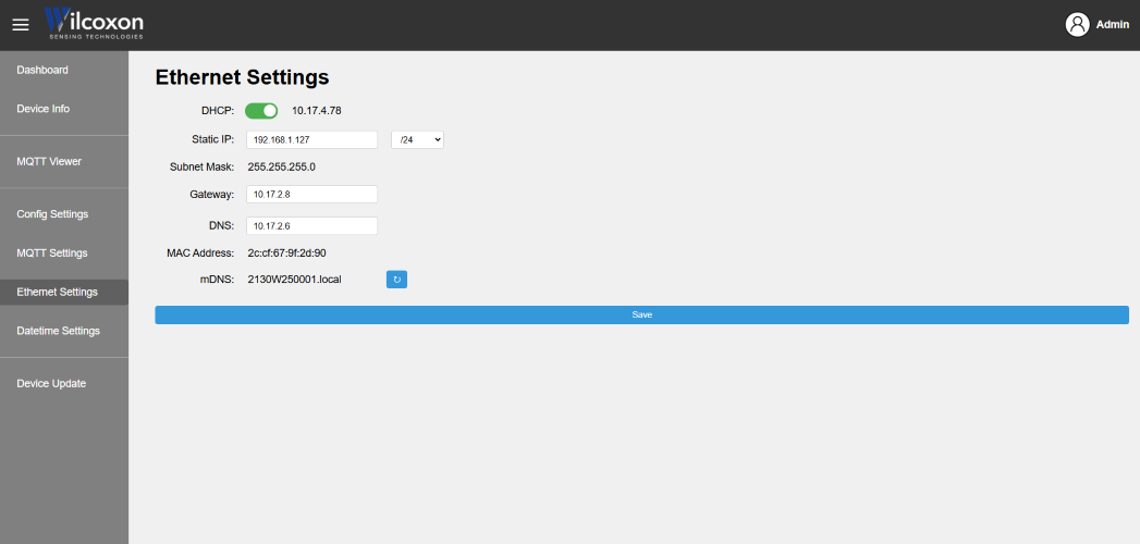 The VDS Device Center is a built-in, browser-based interface used to configure, monitor, and maintain the VDS130. It allows users to set network and MQTT parameters, configure per-channel measurement settings, and manage user access. An MQTT viewer shows exactly what data the device is publishing. The Device Center also supports software, firmware, and system updates, enabling commissioning and ongoing device management without external tools.
